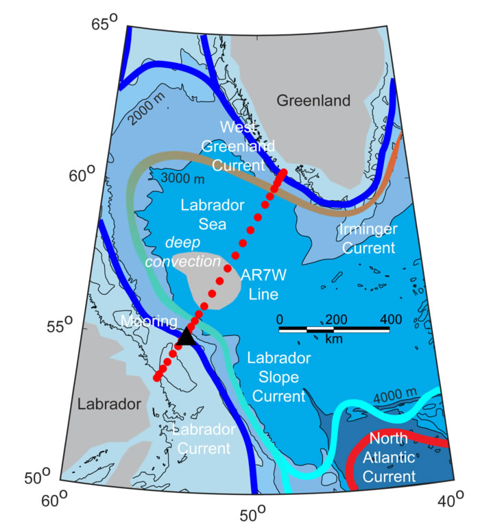 Map of AR7w Line stations in relation to bathymetry and current systems.