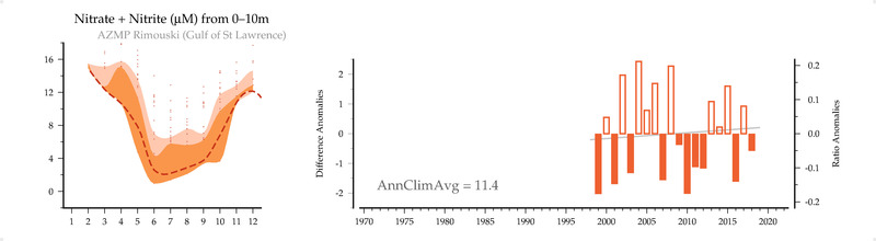 Nitrate + Nitrite (mmol/m3) from 0-10m