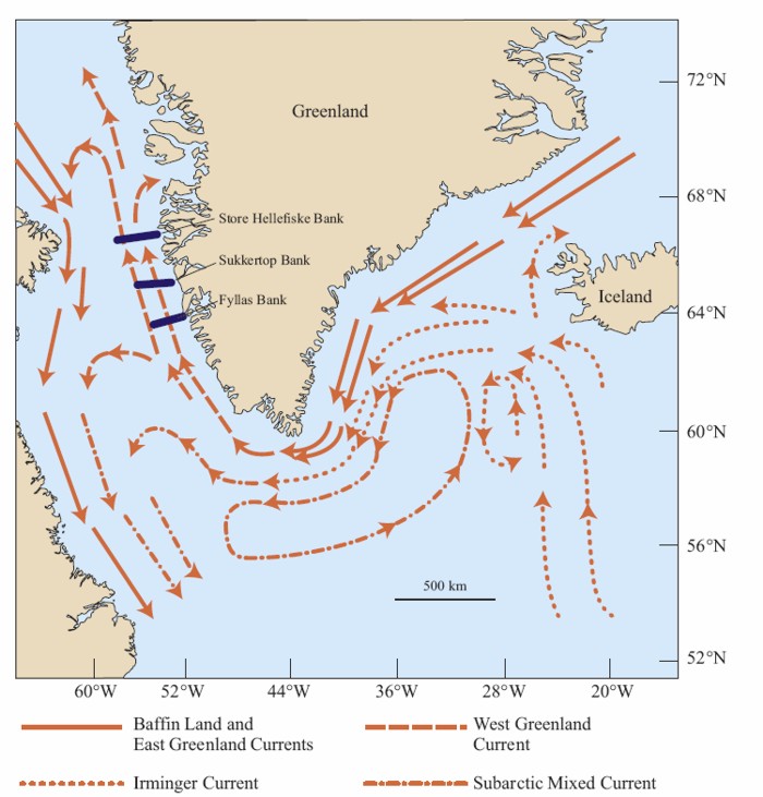 Location of three hydrographic sections off West Greenland (Pedersen & Smidt 2000).
